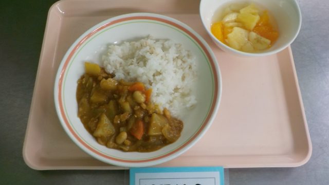 今月の給食です。1月9日(金)献立:御飯(麦入り)、大豆とツナカレー、フルーツポンチおやつ:おしるこ、麦茶